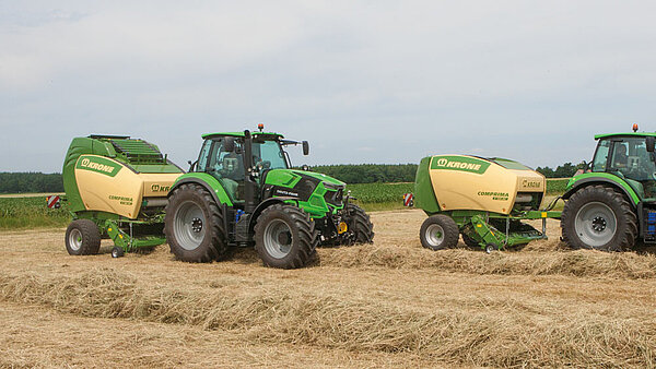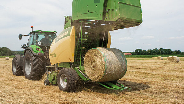 KRONE 的 Comprima 具有独特的打捆技术。NovoGrip 链板式输送带可打捆所有类型的作物。结合极其强大的喂入系统,该机器能够以高吞吐量生产高密度草捆。