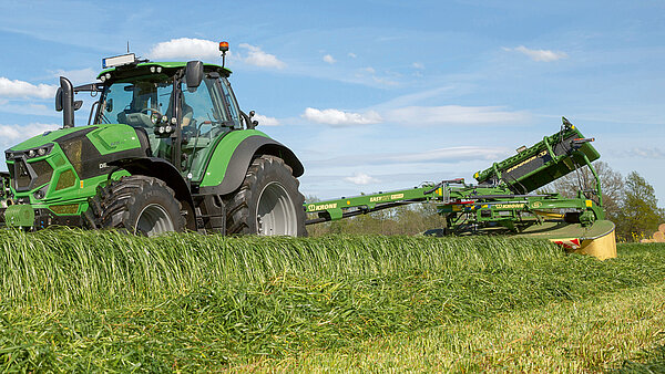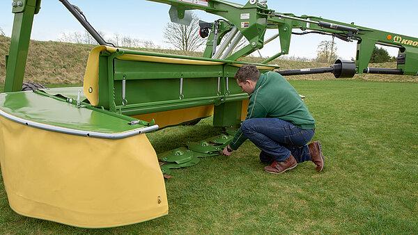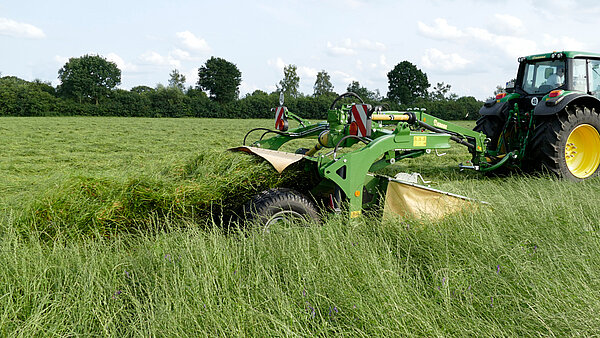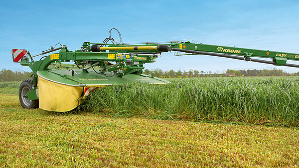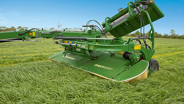 KRONE DuoGrip 将割草机悬挂在其重心位置,并通过两个臂杆进行导向。这种设计使切割器能更精确地贴合地面轮廓,从而更好地保护草皮。这样,即使在困难条件下,机器也能生产出高质量的饲草。