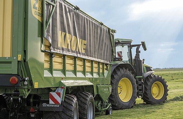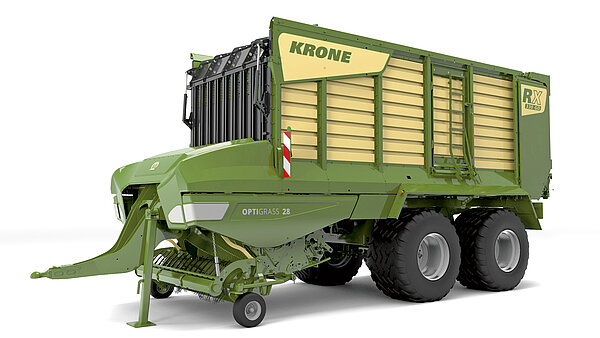 KRONE RX —— 一款高效的、运输容积为 33 至 40 m³ 的自装填及饲草运输车。这款两用自装填及饲草运输车真正满足其双重用途的要求:既可作为牧草收获链中的装载和饲草运输车,也可作为玉米运输链中由收割机装填的青贮饲料挂车。凭借高性能的‘OptiGrass 28 和 37’切割系统,它能提供干净、精确的切割,并在整个宽度上实现结构均匀的饲草摊晒。得益于其多功能性、运行可靠性和高效率,使用 RX 饲草车具有极高的经济效益。