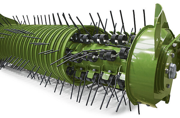 新的集成式转子理念结合了众多优势,显著提高了切割系统的性能。作为切割转子一部分的 22 厘米宽螺旋推运体,确保作物均匀、干净地被输送到转子中心。这产生了强劲的作物流和最大的捡拾宽度,同时,由于在输送槽中的最佳预压缩,获得了尽可能好的切割质量。该理念结合切割转子的巨大直径,使 RX 能够以最佳的摊晒质量实现最大吞吐量。