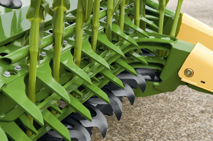 对于精密田间切碎机,喂入机构已经决定了切碎质量。其中预压辊起着特别重要的作用。预压力越高,切割质量越好。科罗尼在此开辟了新途径:六个大直径的预压辊——而非通常的四个——能更好地预压实饲料。这使得收获作物在切碎滚筒中更容易、更精确地被切割。通过无级液压驱动,可以从驾驶室调节切段长度。