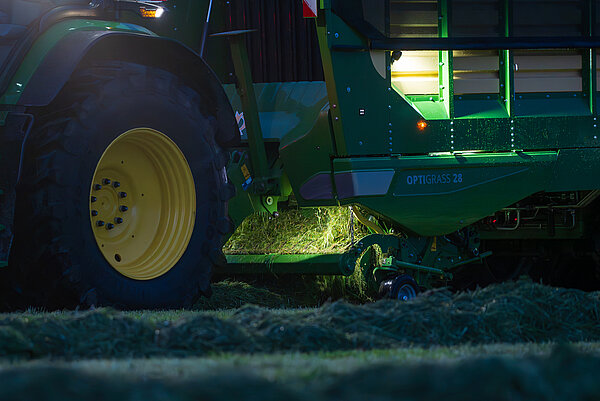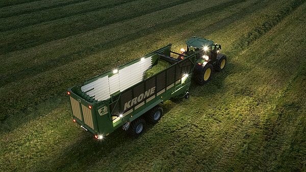 KRONE RX 的高级照明套件不仅增强了安全性,还提高了夜间生产力。高级套件为周围环境、装载空间、作物流和驱动部件提供了最佳照明。额外的工作灯可作为选装件加装。