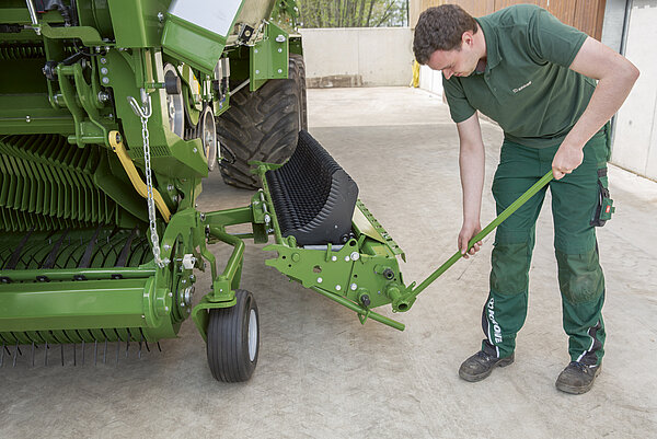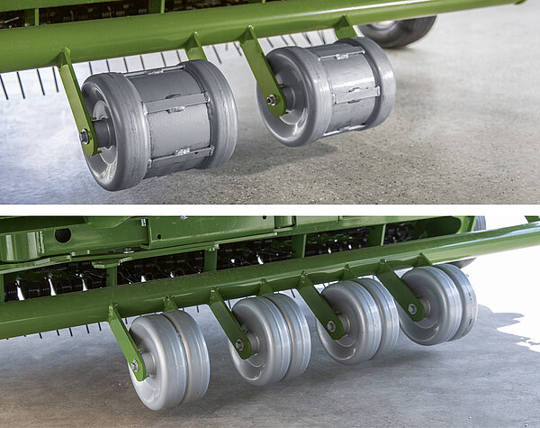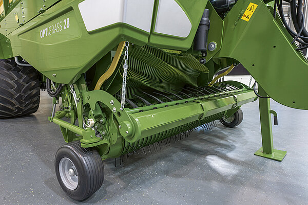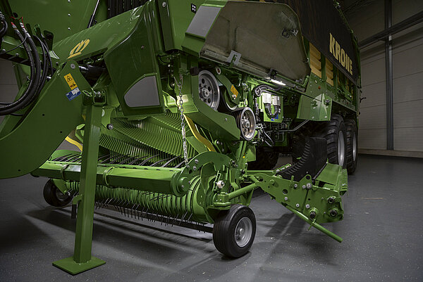 捡拾器后方的宽大导向轮确保在潮湿地面上也能干净地喂入饲草。高度可调的轮子可防止其下沉过深,从而保护其免受损坏。28 毫米 OptiGrass 切割单元有四个轮子,37 毫米切割单元有两个。
