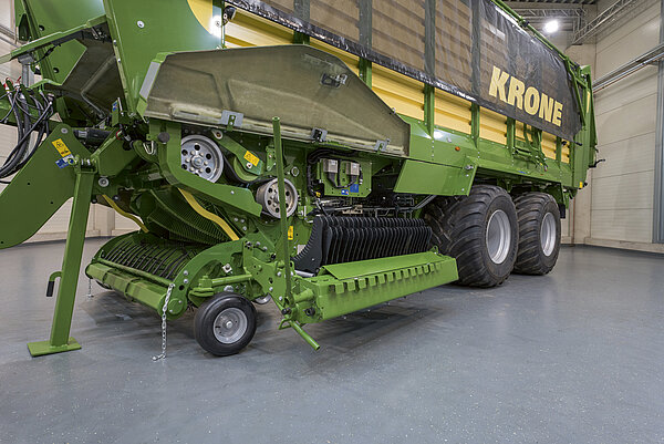 最大的吞吐率和高装载速度几乎不允许任何差错。然而在实践中,带有变化作物的不均匀草条更为常见。得益于强大的 KRONE Powerbelt,这些短期负载峰值得到缓冲,过载保护装置也不会跳闸。使用 KRONE Powerbelt,您可以在别人停滞不前时继续前进。