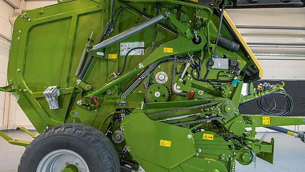 启动辊和两个网绳辊结合草捆室皮带的浅角度,实现了平稳的草捆启动。它们还确保在草捆室满载时实现可靠的草捆卷绕。