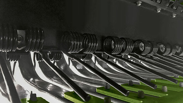 科罗尼特意移除了用于控制弹齿的凸轮轨道。EasyFlow 不使用许多易磨损的运动部件,而是采用特殊的剥离器,确保弹齿角度始终正确、长度理想。弹齿直径为 6 毫米,并配备大线圈安装,特别强劲且耐磨。它们以 55 毫米的窄间距排列,也能彻底捡拾短茎秆和重型作物,且无污染。