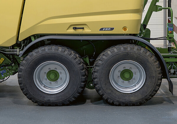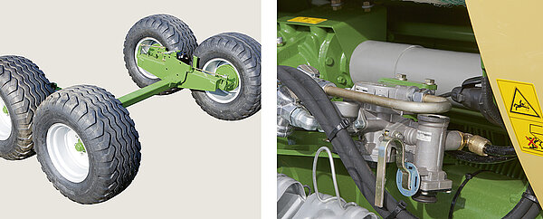 双轴是 CF 和 CV 打捆与裹包一体机的标准配置,也是 F 和 V 型号的选配。双轴提供更大的牵引杆负载、更平稳的行驶和更好的道路稳定性。由于提供更大的接触面积,它们也减少了车辙并保护土壤。有两种不同的轮胎尺寸可供选择 - 500/60 R 22.5 和 600/50 R 22.5。