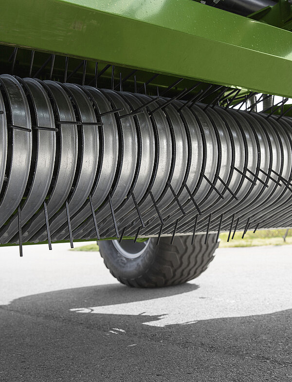 弹齿厚 6 毫米,并具有大直径线圈——这两种特性使其特别耐抗和耐磨。在 EasyFlow 转子上排列成五个螺旋行,间距为狭窄的 55 毫米,使 EasyFlow 能够毫无损失地捡拾即使是短而重的作物。