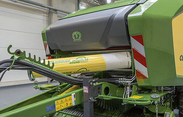 ComPack CV 150 XC Pro 配备了一个强大的双臂裹包机,转速高达 36 转/分钟。深槽和裹包台侧面的大型导辊确保即使在困难的操作条件下,裹包过程中草捆也能被均匀驱动。