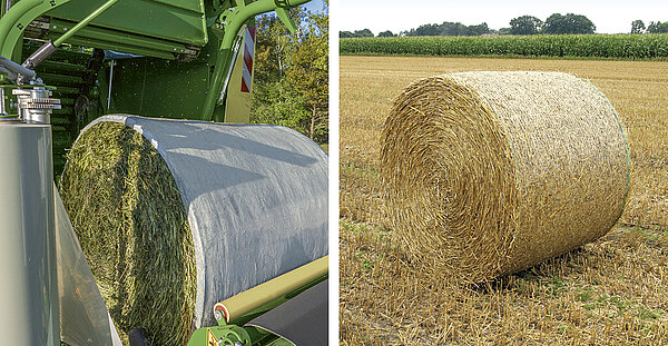 网绳包裹是标准配置,但您也可以选择薄膜包裹底涂层。这种拉伸膜宽 1.28 米,单面有粘性,可提高青贮草捆的质量,因为它对草捆外层施加更大的压力,减少其中滞留的空气量,并使其在饲喂场上更容易破碎。