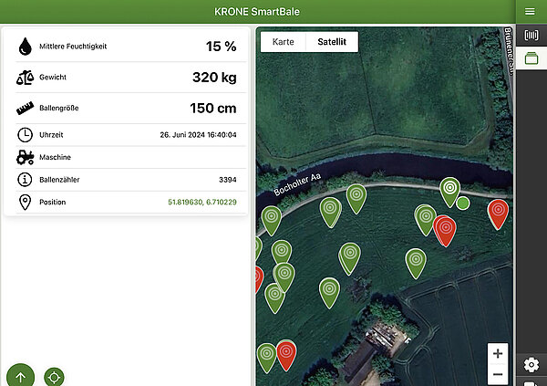 科罗尼 SmartBale 在草捆地图上显示所有存放的圆捆和方捆。根据打捆机设备,SmartBale 应用程序还提供其他信息,如湿度、重量、尺寸以及作物是否经过切割。湿草捆用颜色编码,以便轻松识别并分开存放。