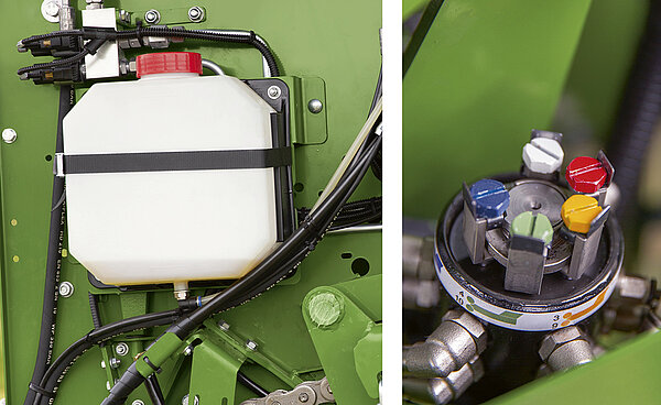 用于科罗尼 ComPack 的可选全集成青贮添加剂单元,可以有针对性优化青贮过程。两个各 110 升的罐可用于不同的添加剂。计量率可通过吞吐量、草捆重量、湿度或时间控制——甚至可以为每个草捆单独控制。该单元在捆扎循环期间自动关闭。